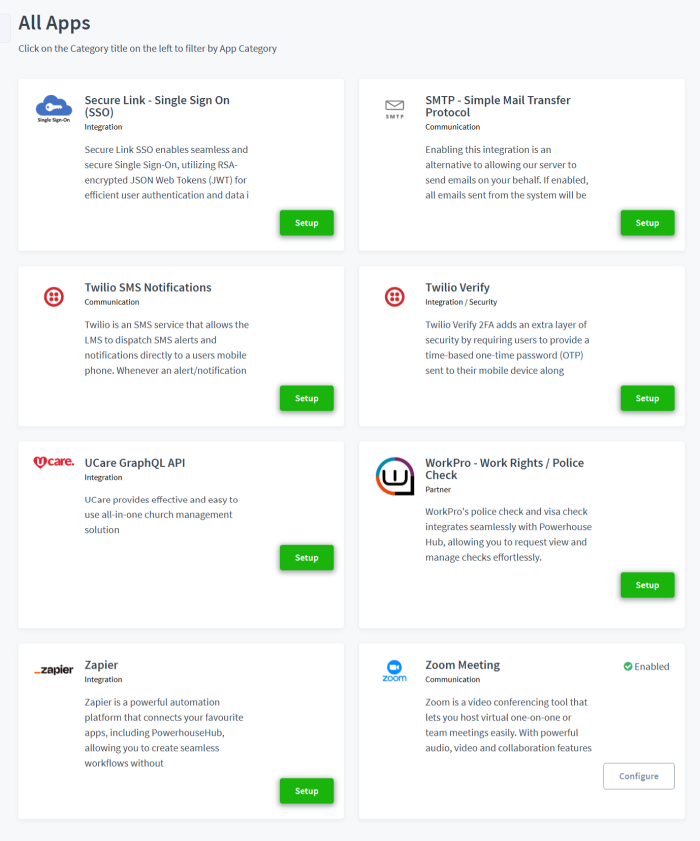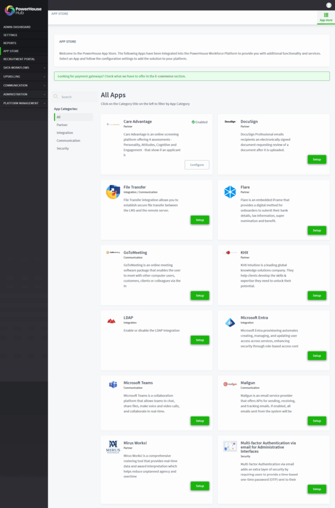 The PowerHouse App Store features a wide range of premium applications with a seamless integration with the PowerHouse platform. Your admins open the App Store, select their preferred apps & complete the configuration to enable the functionality. Select from third party apps like Microsoft, DocuSign and webinar products. Choose services like SMS, SSO and email solutions. Enable security settings such as 2FA, MFA and background checks.